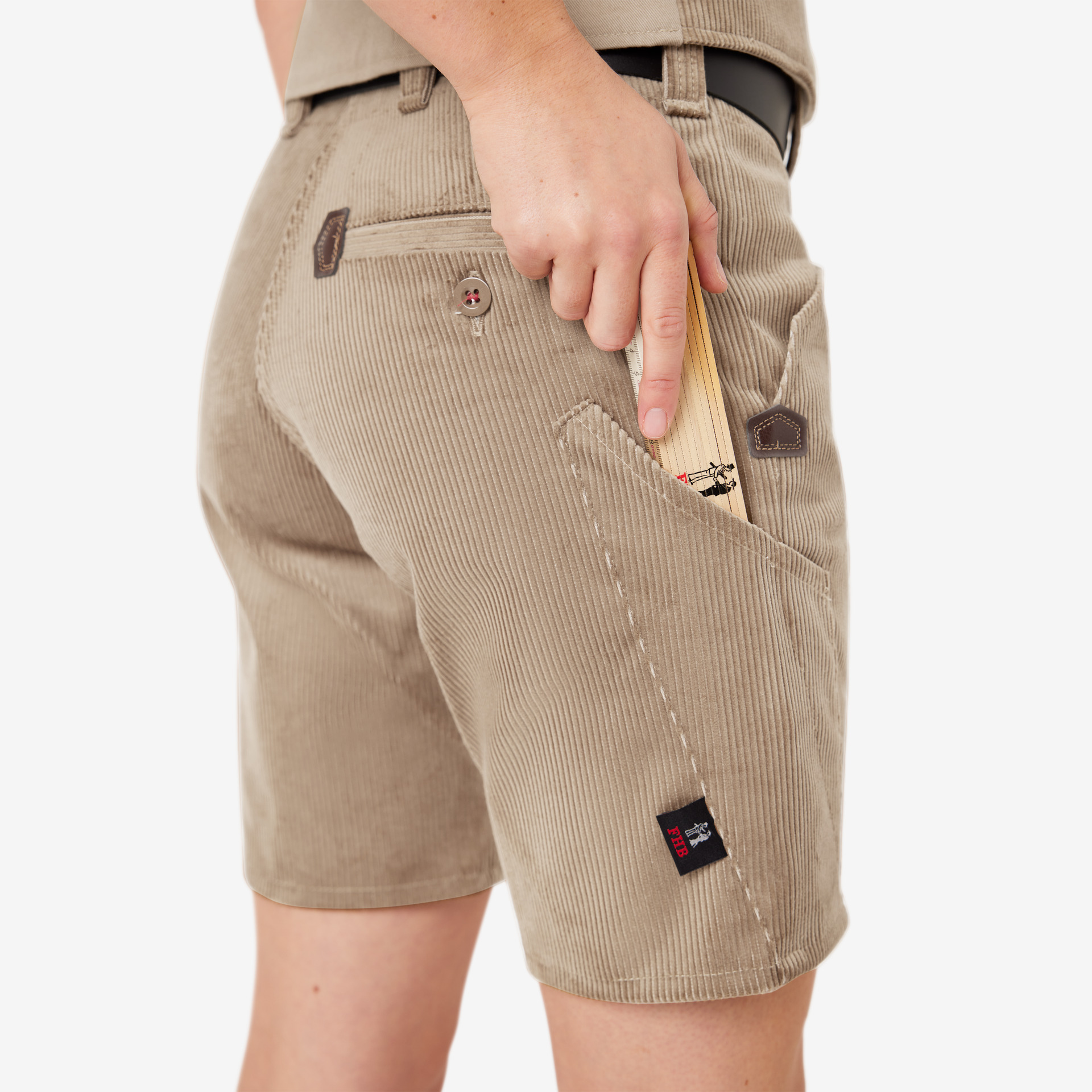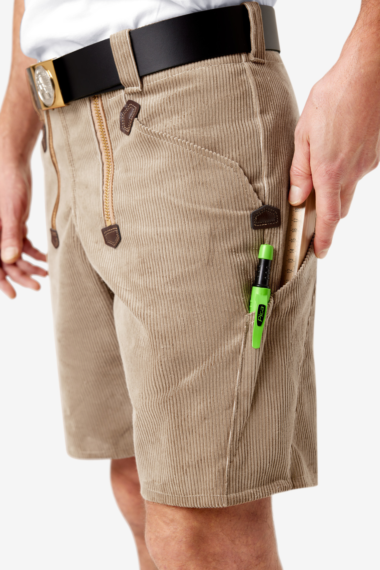 Zunftshorts aus GENUACORD, 2 Zollstocktaschen (Modelländerung: neues Modell hat 2 Zollstocktaschen, teilweise noch gemischtes Lager bei FHB), Genuacord ist leichter als der robuste Trenkercord.Ein feiner Cord mit 24-43 Rippen auf 10 cm. Bei Grösse 50 beträgt die Seitenlänge 48 cm, Ideal für den Sommer.