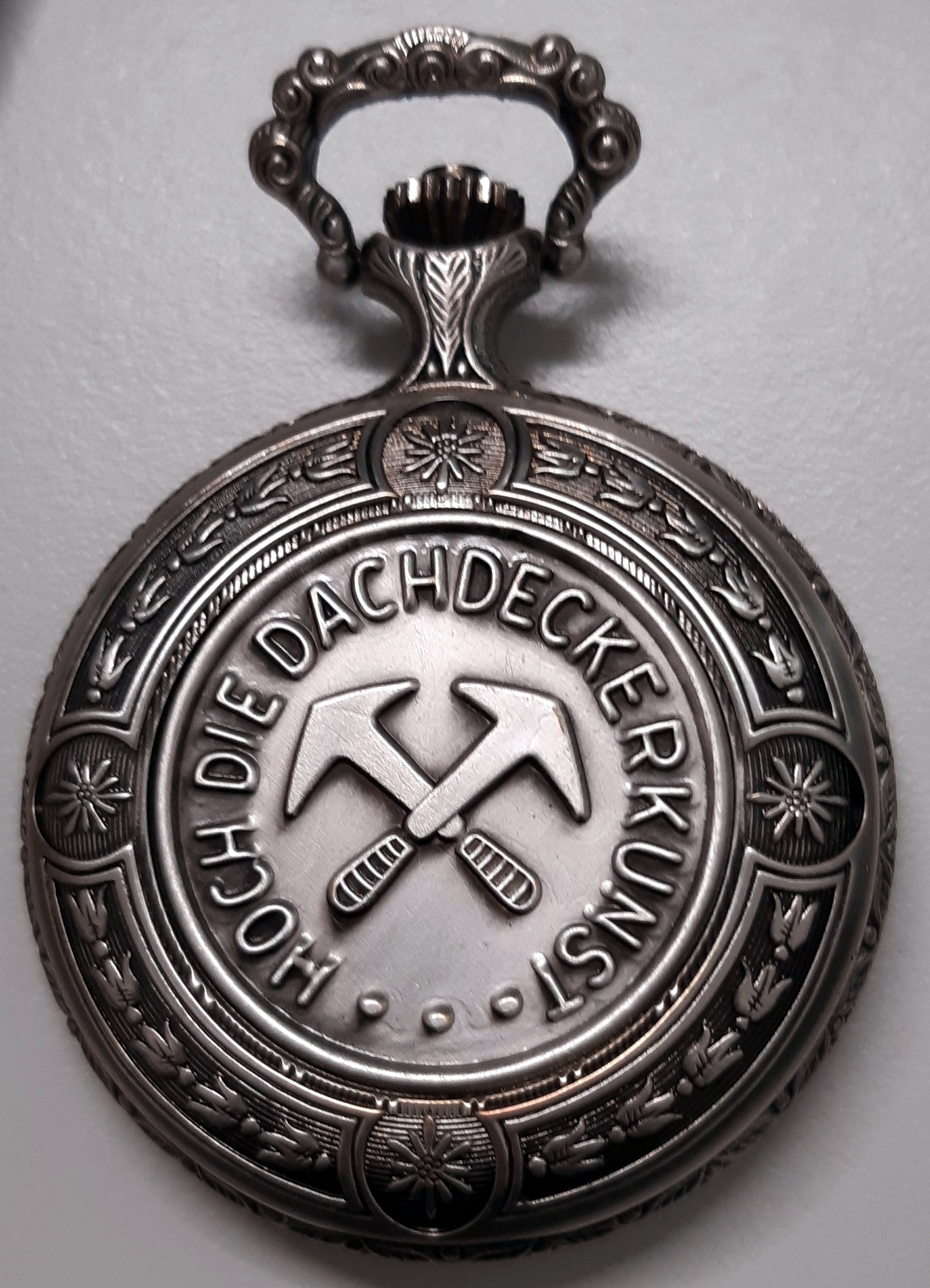 Taschenuhr CP mit Spruch - Hoch die Dachdeckerkunst - und Zunftsignet