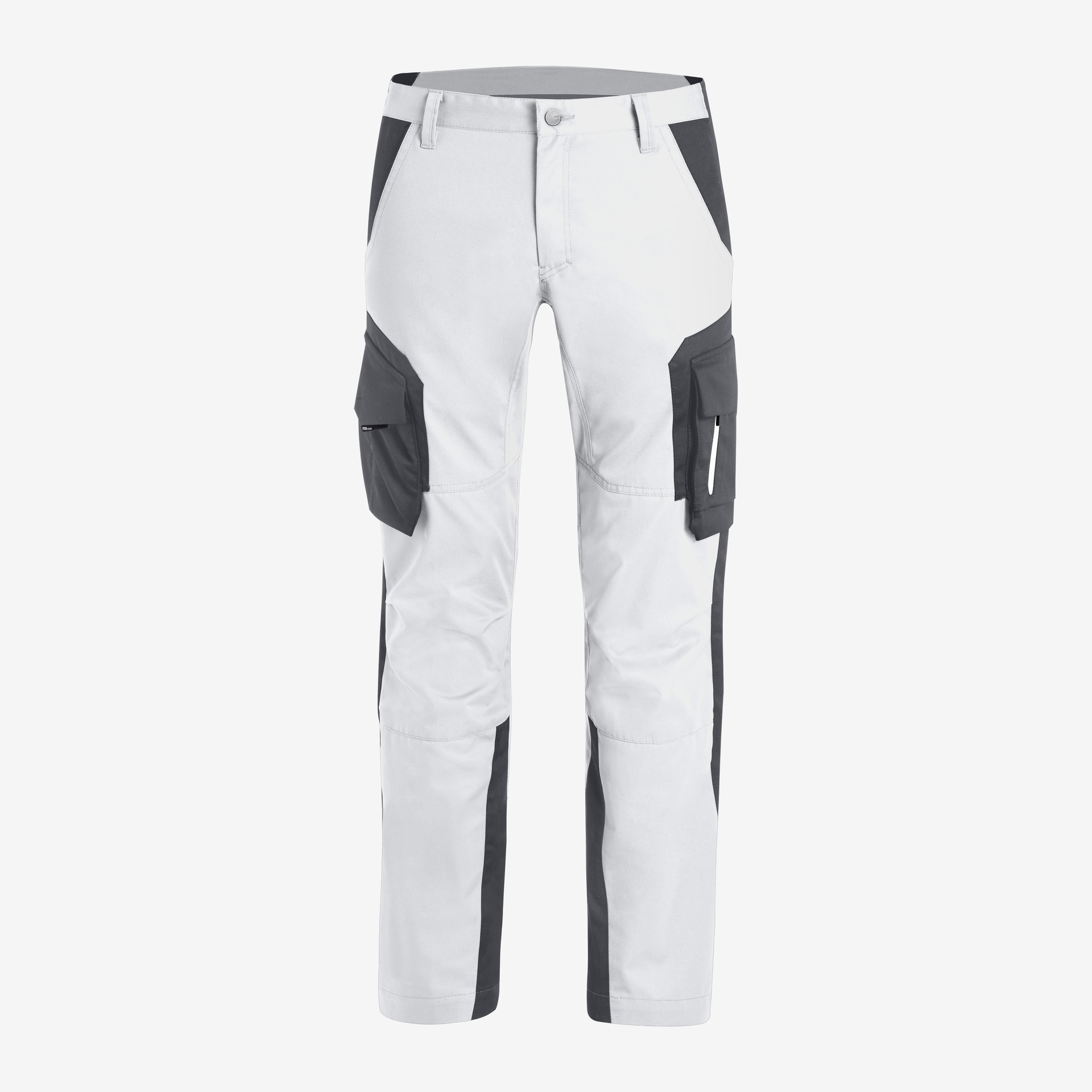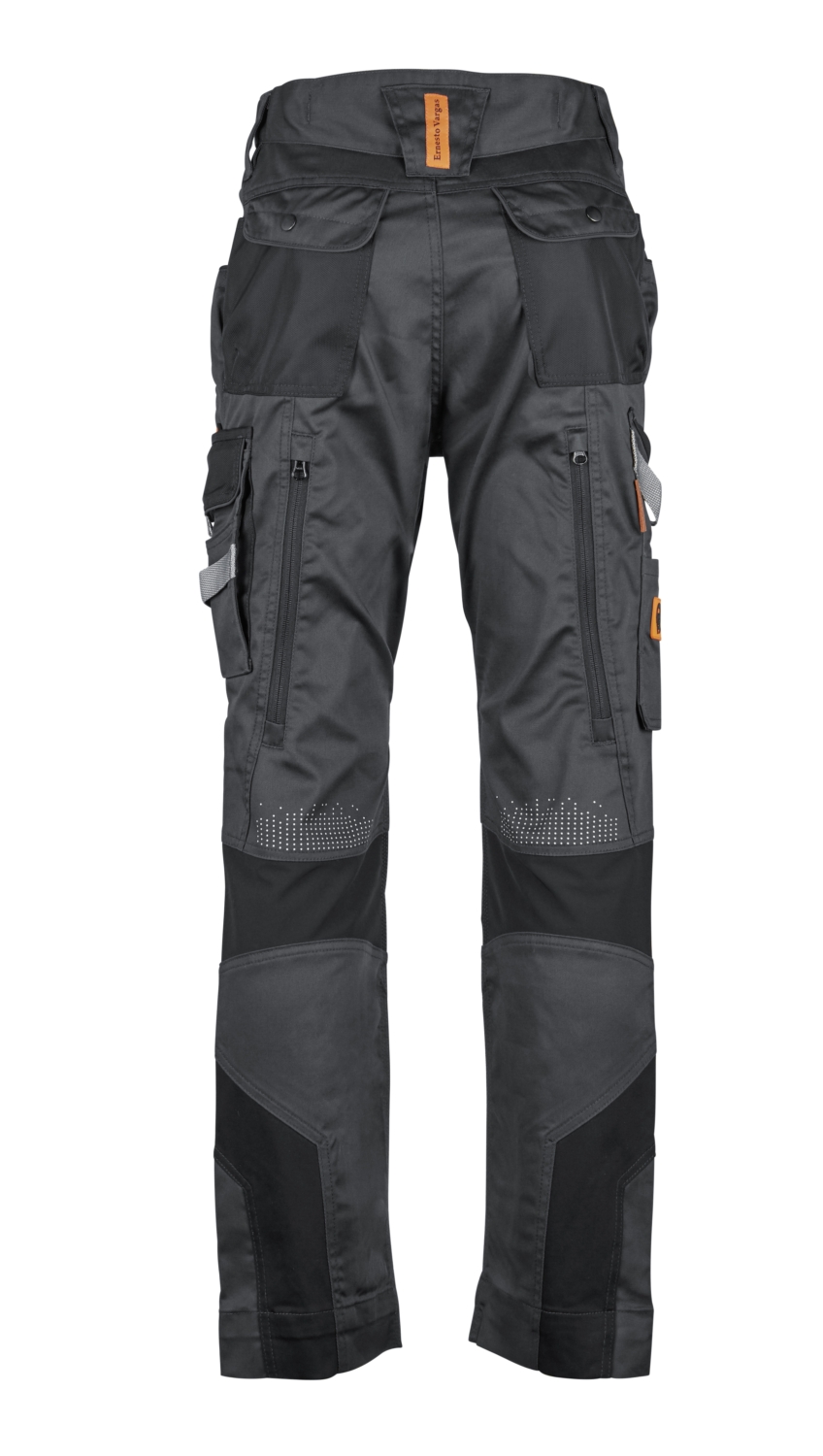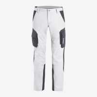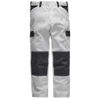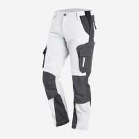 2 grosse Seitentaschen, 2 grosse Gesässpatten-taschen, rechts 1 Zollstocktasche mit Stifttaschen, links Beintasche und Handytasche, vorgeformte Kniepolstertasche, weisse Kontrastriegel zur Verstärkung der Taschenecken, reflektierende Paspel