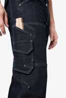 Jeans Arbeitshose LYCRA-STRETCH, 2 grosse Seitentaschen mit 1 Münztasche, 2 grosse Gesässpattentaschen, 1 Zollstocktasche und Handytasche, 1 Volumen Beintasche mit Patte und Stifttaschen. innenliegende Kniepolstertaschen