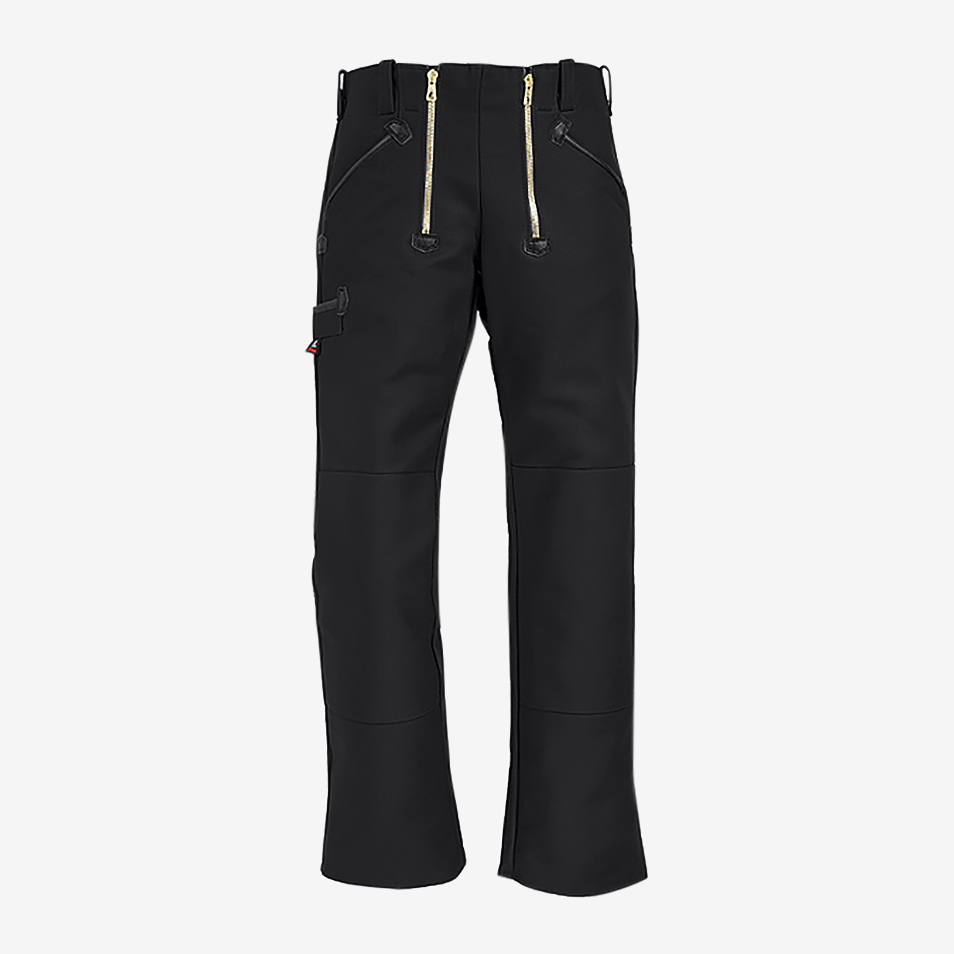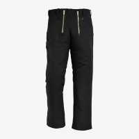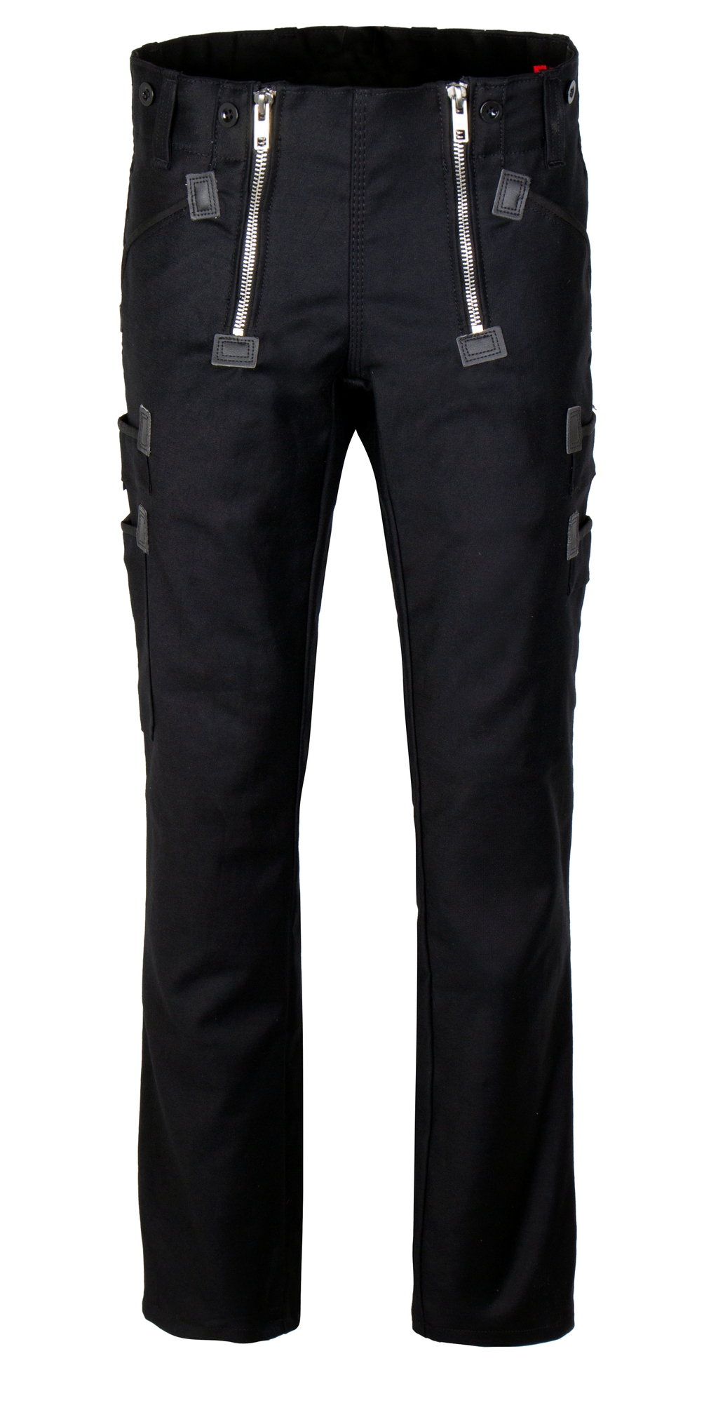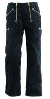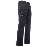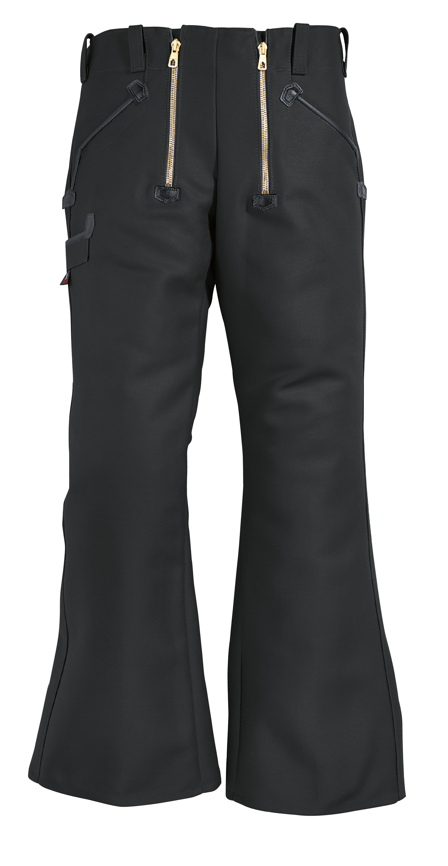 Röhren-Zunfthose Ursprungskollektion, Fussweitenumfang 36 cm, 2 Zollstocktaschen, schwarze Taschenkunstlederpaspelierung, 1 Gesässtasche, matt-schwarze YKK-Reissverschlüsse, symmetrische Zähne, galvanisiert, poliert und extra stark durch massive Anfangs- und Endstücke