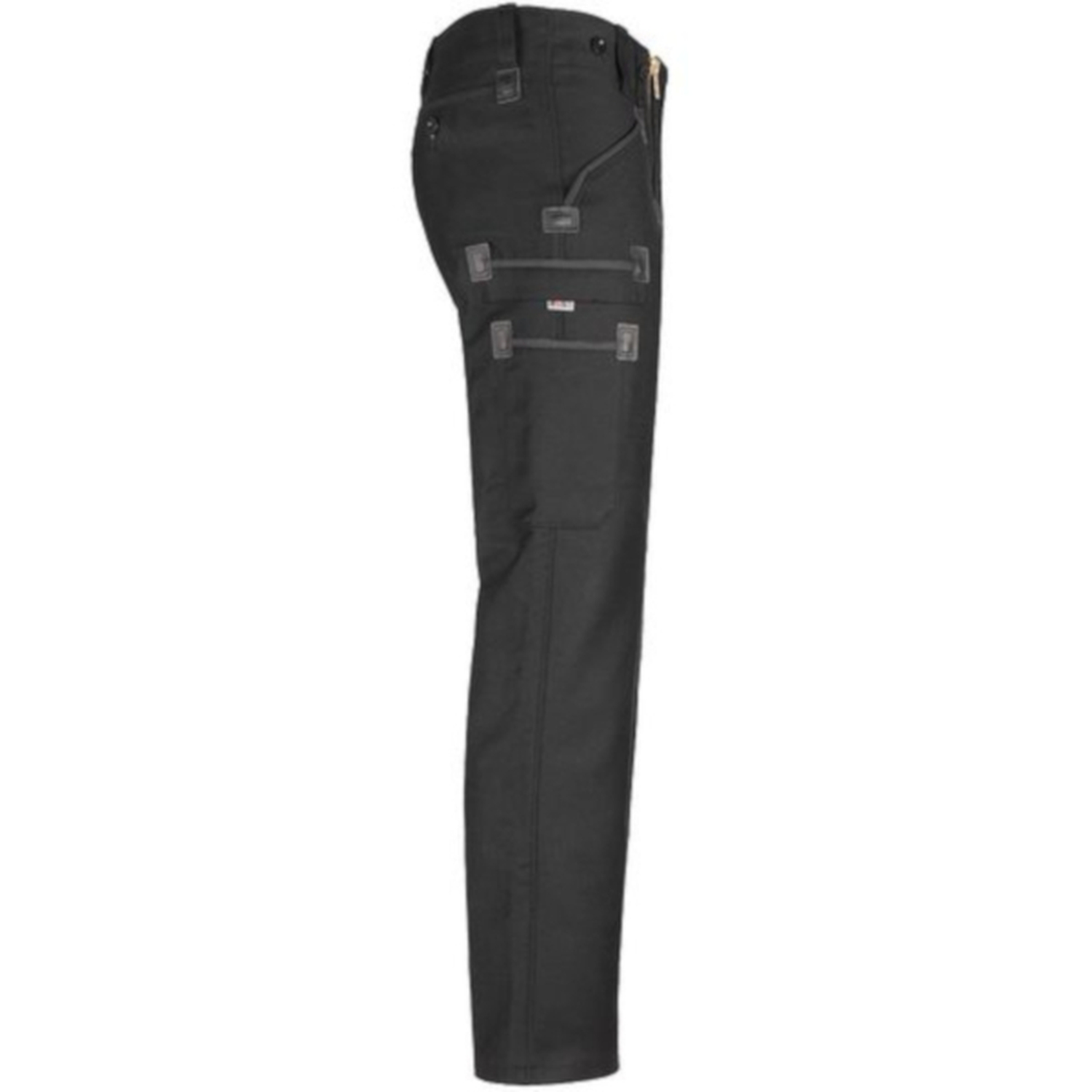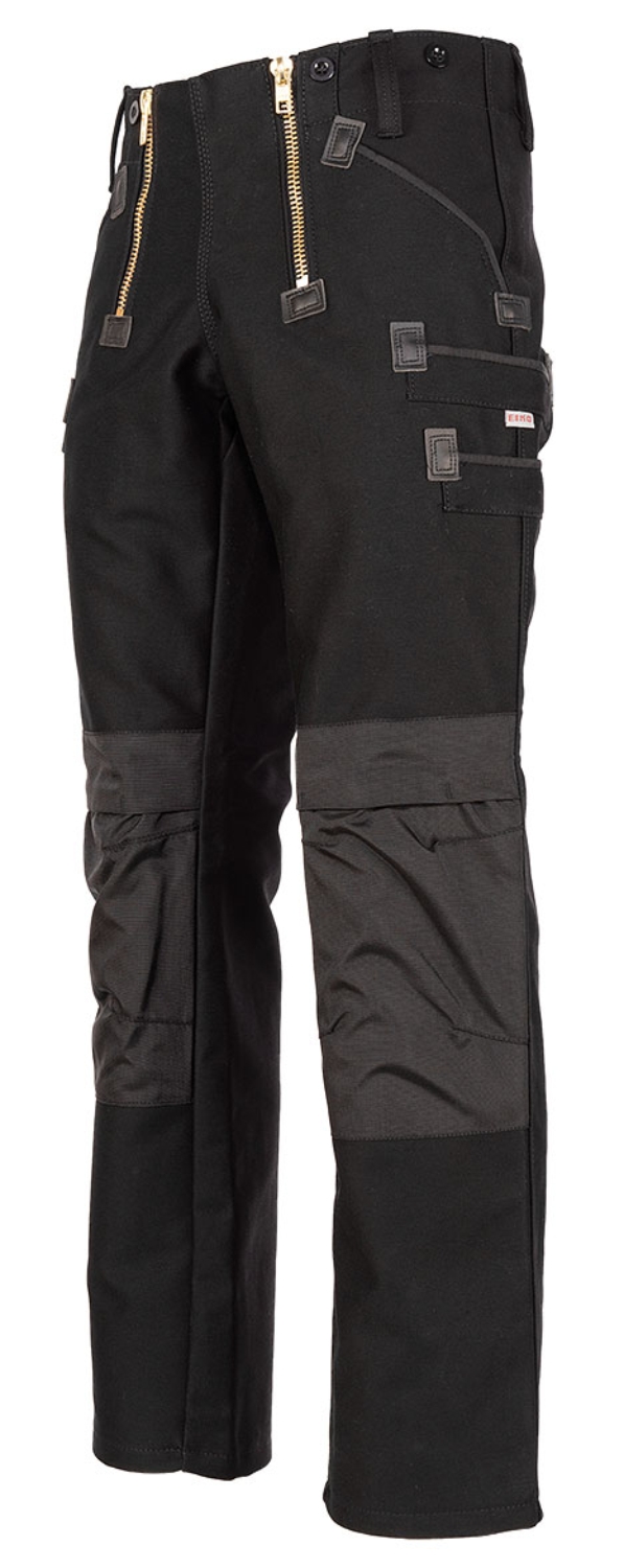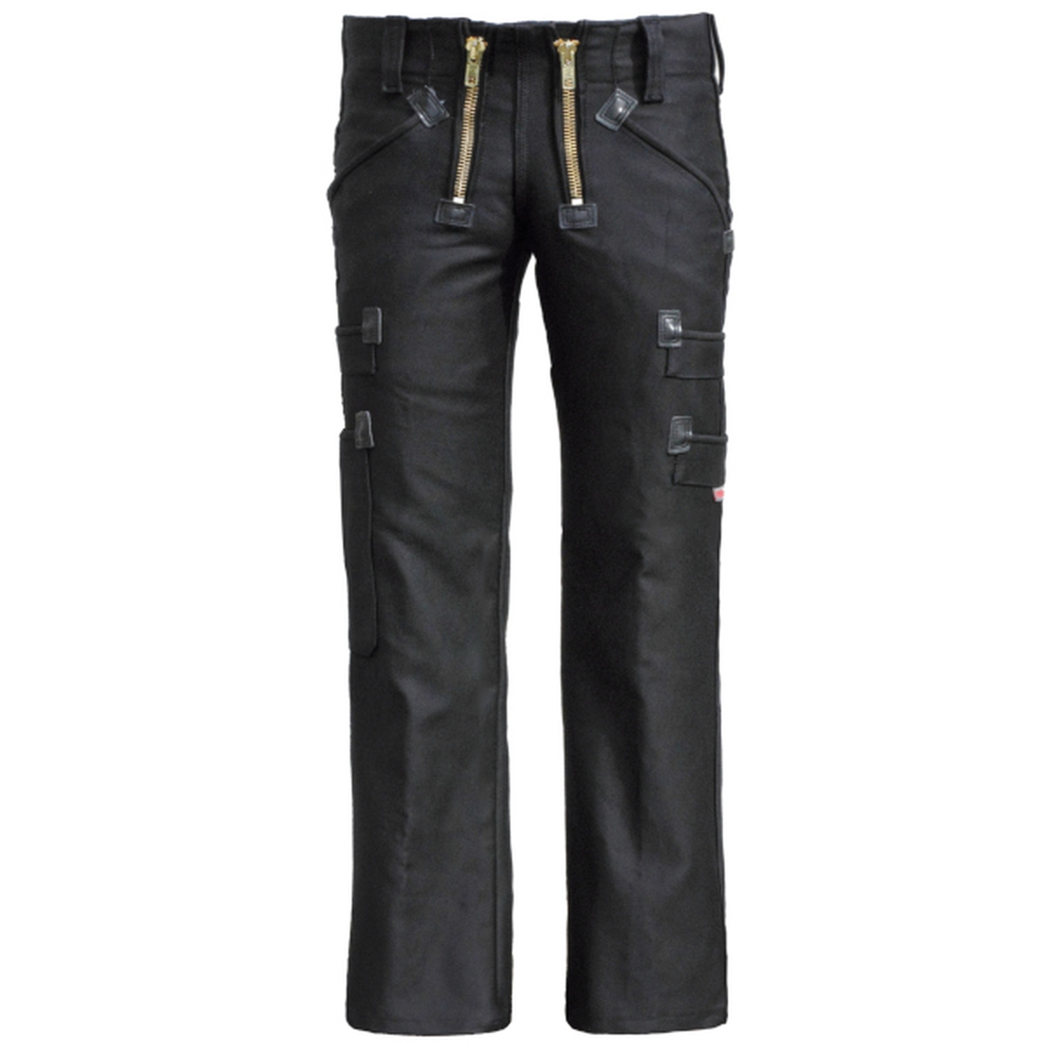 Röhren-Zunfthose Ursprungskollektion, Fussweitenumfang 36 cm, 2 Zollstocktaschen, schwarze Taschenkunstlederpaspelierung, 1 Gesässtasche, matt-schwarze YKK-Reissverschlüsse, symmetrische Zähne, galvanisiert, poliert und extra stark durch massive Anfangs- und Endstücke