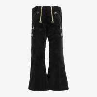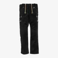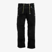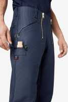 Rechts und links mit Metertasche, zusätzlich rechts mit Stiftfächern, eine Gesässtasche rechts, die Ecken sind verstärkt mit Kunstleder (Dreiecken), Reissverschlüsse goldig, Kappnähte im Schritt, Front und Gesäss