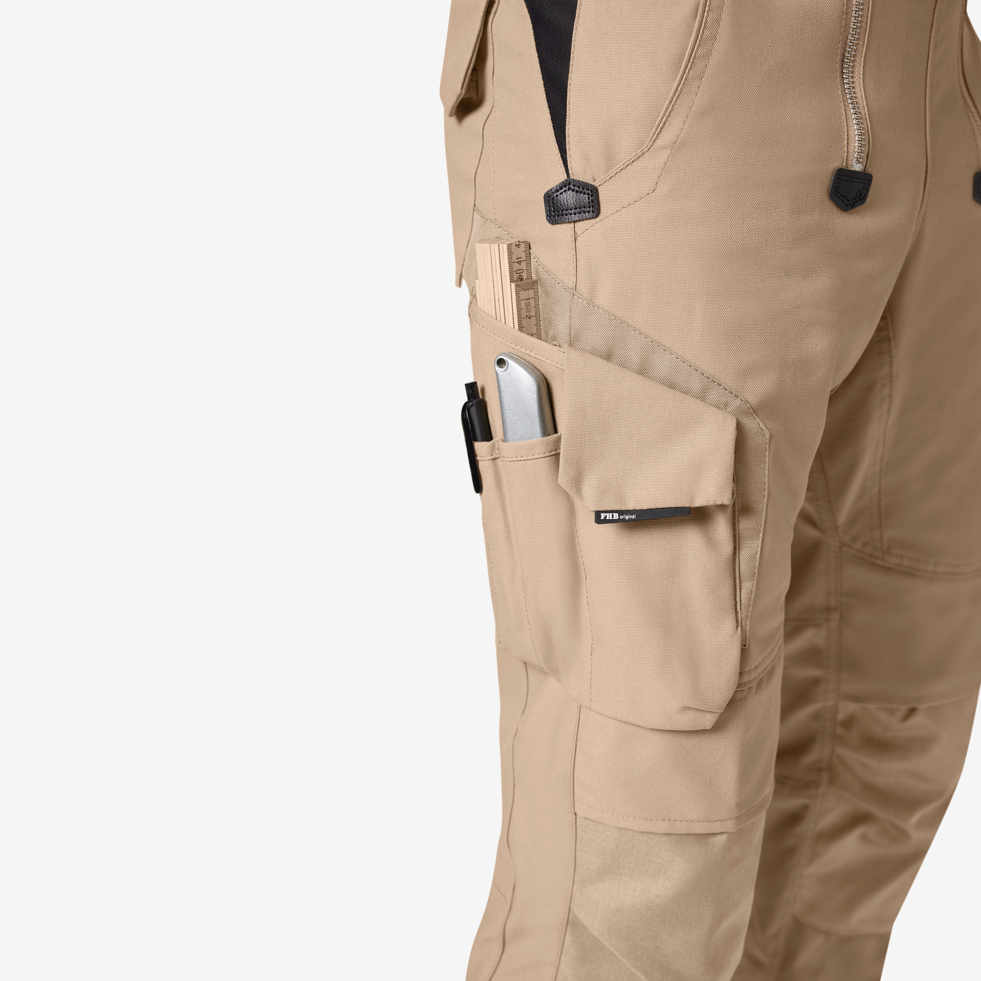 Fussweitenumfang 42 cm, 2 grosse aufgesetzte Gesässtaschen, schwarze FHB-typische Kunstleder-Fünfecke zur Taschen- und Reissverschlussverstärkung, 1 Zollstocktasche, 1 Multifunktions-Beintasche inkl. Zollstock- und einer Handytasche